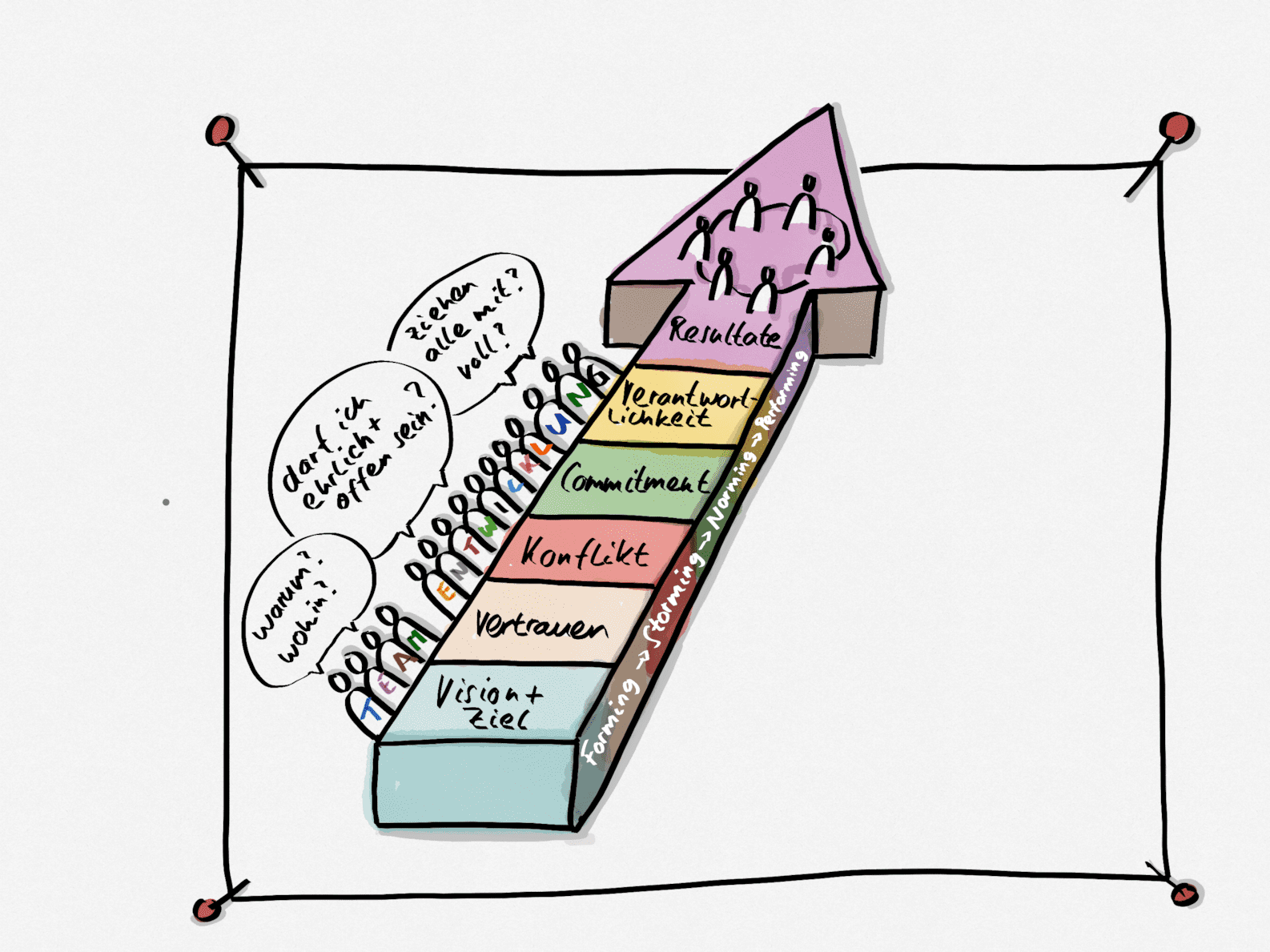 Ein hilfreiches Modell liefert die Pyramide von Patrick Lencioni mit den Entwicklungsschritten Vertrauen, Konfliktfähigkeit, Commitment, Verantwortung und Resultate. Doch selbst diese Stufen greifen erst, wenn Klarheit über das gemeinsame Ziel herrscht. Diese Basis der Pyramide hat Lencioni aus meiner Sicht schlicht vergessen: Teams haben gegenüber Gruppen ein gemeinsames Ziel. Verantwortung entsteht dann, wenn die Mitglieder sich auf eine Vision verpflichten und bereit sind, füreinander einzustehen.